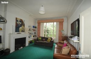 The wall that separated the room and the old kitchen in the above image was removed, this created a large open space which was supplemented by an extension that created a large living room to the right of the kitchen in the photos. The previous flooring, fireplace, furniture and the kitchen was removed.