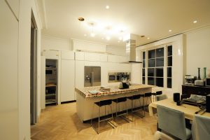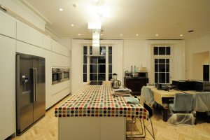 The images below show the finished kitchen at the end of the project. The room was fully re-plastered, painted, the skirting boards and covings were replaced.